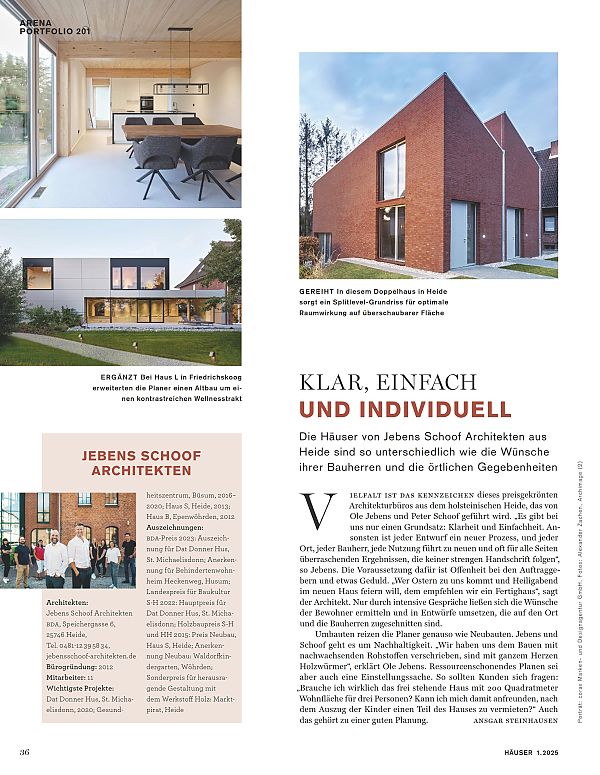 In der aktuellen Ausgabe des Magazins "Häuser" vom Verlag Gruner & Jahr wird unser Büro in der Reihe "Portfolio" vorgestellt. Das Format stellt in jeder Ausgabe herausragende Architekturbüros vor, die sich im Bereich Wohnungs- und Hausbau durch besonders gelungene Beispiele qualifiziert haben. Der Verlag hat dazu unser "Haus L" und das Doppelhaus im Ostroher Weg in Heide ausgewählt. Wir freuen uns sehr über diese mediale Aufmerksamkeit und sind stolz darauf!