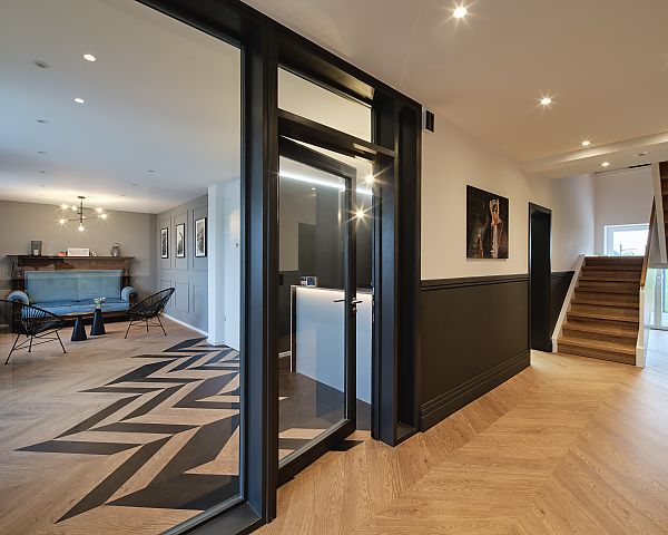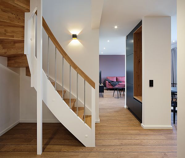 Durch das lichtdurchflutete Foyer betritt man den Altbau. Benachbart befindet sich die großzügige Lobby mit Rezeption. Gegenüber befindet sich der Gastraum mit der historischen Bar. Über das Treppenhaus gelängt man ins Obergeschoß zu den hochwertig ausgestatteten Maisonette-Ferienwohnungen mit ein oder zwei Schlafräumen. Hier, wie im ganzen Haus, wurden behutsam die Qualitäten des historischen Bestandes herausgearbeitet und durch harmonische Farbgestaltung, Bäder und moderne Möbel ergänzt.