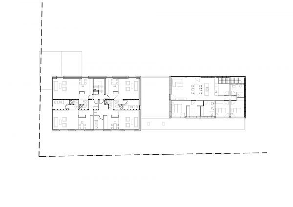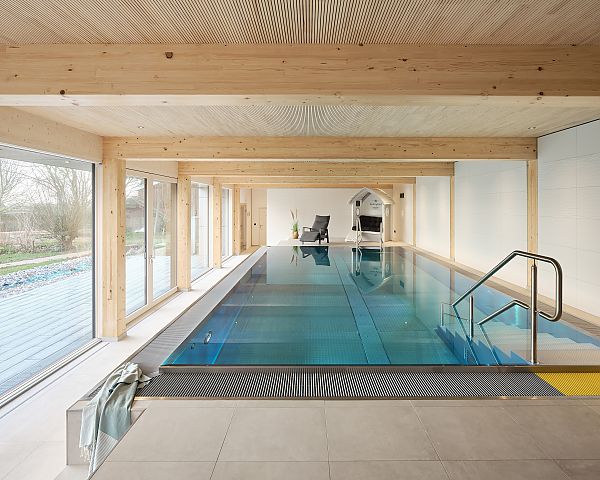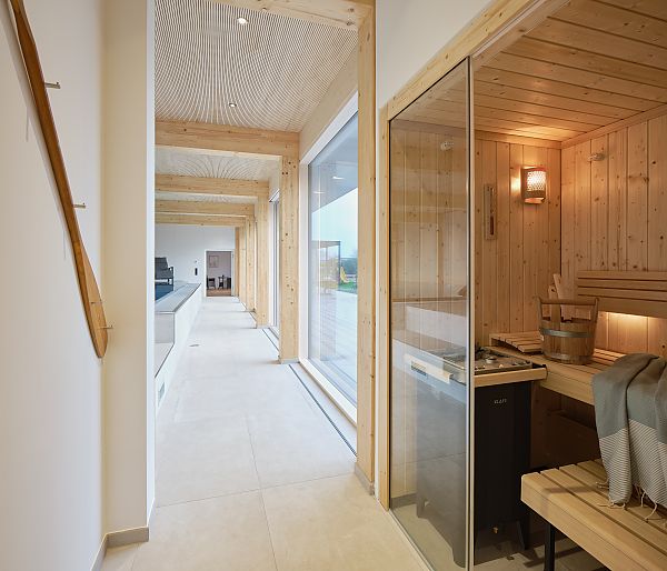 Dem Altbau wurde durch die Architekten ein moderner Anbau entgegengesetzt. Dieser umfasst den großzügigen Wellnessbereich mit Schwimmbad mit Sonnenterasse, Sauna und Ruheraum sowie die Betreiberwohnung. Die bodentiefen Fenster und Schiebetüren lösen die Grenzen von Innen- und Außenraum auf. Der Neubau ist ein Holz-Skelett-Bau mit Holztafelbaufüllungen. Das Tragwerk und die Sichtdecken prägen mit Ihrem natürlichen Charme die Innenräume. Die äußere Gestaltung ist minimalistisch und anspruchsvoll detailliert. Spannungsreich und selbstbewusst stehen sich Alt- und Neubau gegenüber und harmonieren zugleich als Ensemble.