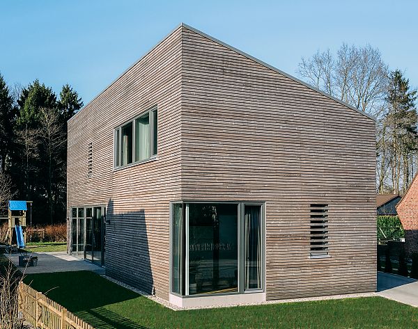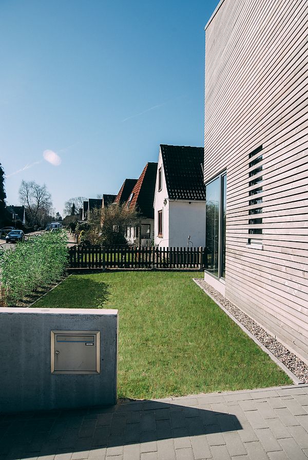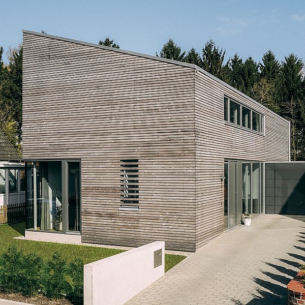 Was früher ein öffentlicher Durchgang einer Siedlung zum Wald war, stand anfangs als schmales Restgrundstück für den Bau eines Wohnhauses zur Verfügung. Die Ausrichtung des Gebäudes stellte eine Herausforderung dar, denn der Wald liegt nördlich des Grundstücks, während im Süden die Straße vorbeiführt. An die langen West- und Ostseiten des Grundstücks grenzen hingegen die nahen Nachbarhäuser. Die Lösung bestand darin, das Wohnhaus mit einer schmalen Giebelseite zur Straße auszurichten, von Osten zu erschließen und die Wohn- und Schlafräume nach Westen und Norden zu orientieren. Damit sich das zweigeschossige Gebäude harmonisch in die überwiegend mit eingeschossigen Satteldachhäusern bebaute Umgebung einfügt, wurde ein kompakter, zurückhaltenden Baukörper mit klaren Konturen gewählt. Bündig in die Fassade integrierte Fenster und der Verzicht auf einen Dachüberstand unterstreichen das klare und einfache Erscheinungsbild des in Holzrahmenbauweise errichteten und mit sibirischer Lärche verkleideten Gebäudes.