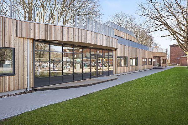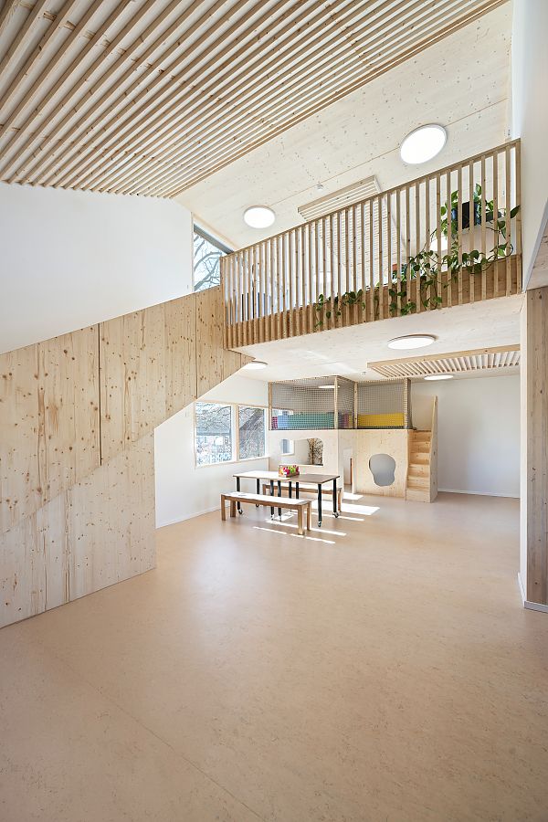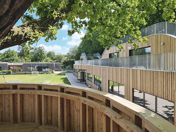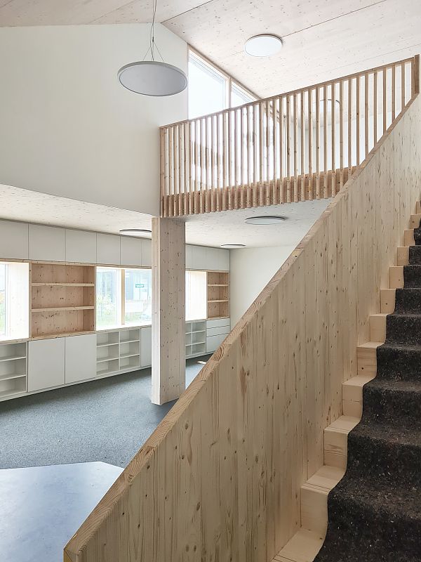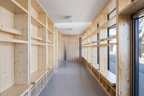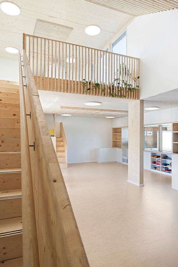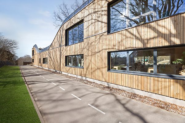 Der Bau besticht durch seine konequente Verwendung von Holz: Außen und Innen dominiert das Material in Form einer unregelmäßigen Holzfassade und vielen sichtbaren Brettsperrholzelementen. Das Bewusstsein der Kinder für einen behutsamen Umgang mit den Ressourcen wird damit spielerisch und selbstverständlich gestärkt.