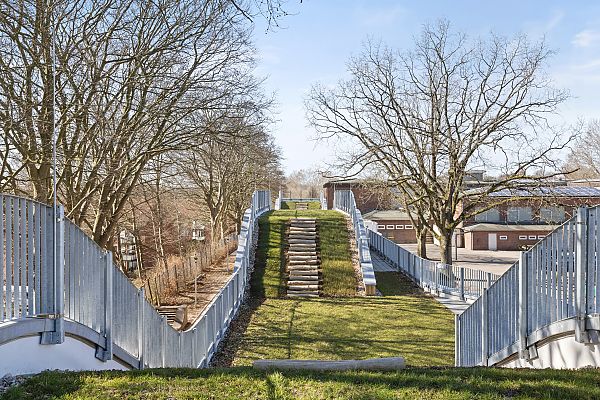 Die augenfälligste Besonderheit des Baus ist die begehbare Dachlandschaft und der direkte Bezug zu der umgebenden Natur inmitten der Stadt Flensburg und in einem sozial eher benachteiligten Viertel. Dieser Wunsch nach einer Nutzung des Dachs kam schon in einer der ersten Planungsbesprechungen vom Bauherrn. So viel Mut wird meistens belohnt, und das Ergebnis spricht für sich: es ist viel mehr ist als ein Gebäude mit Klassenräumen entstanden: eine in allen Ebenen begeh- und erlebbare Spiel- und Lernlandschaft.